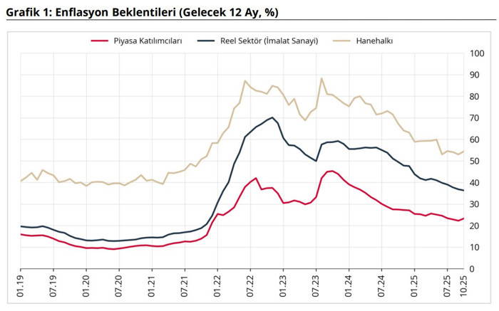 TCMB, Ekim ayında 12 ay sonrası yıllık enflasyon beklentilerini duyurdu. Rapora göre, enflasyon beklentileri bir önceki aya göre arttı. Piyasa katılımcılarının enflasyon beklentisi yüzde 23,26‘ya yükseldi. Hanehalkı beklentisi ise yüzde 54,39 olarak açıklandı. Reel sektörde ise enflasyon beklentisi yüzde 36,30 seviyesine geriledi.