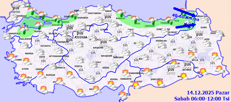 RÜZGAR: Genellikle kuzeyli yönlerden hafif, ara sıra orta kuvvette, Doğu Karadeniz’de batı ve kuzeybatı yönlerden kuvvetli (40-60 km/saat) eseceği tahmin ediliyor.